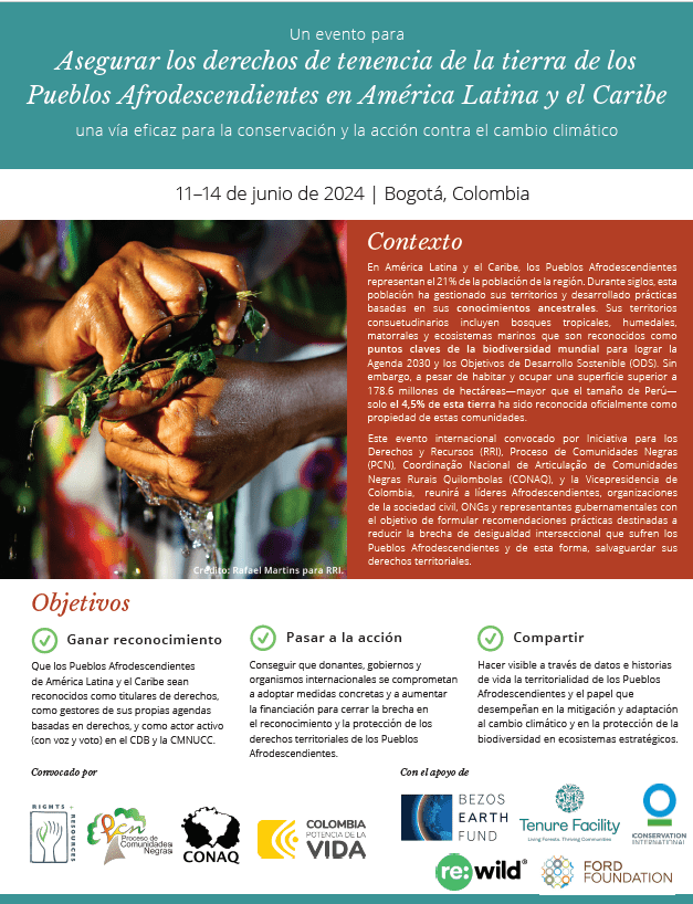 Este acontecimiento histórico, encabezado por la Iniciativa para los Derechos y Recursos y coorganizado por el Proceso de Comunidades Negras (PCN) de Colombia y la Coordinación Nacional por la Articulación de las Comunidades Negras Rurales Quilombolas (Coordenação Nacional de Articulação de Comunidades Negras Rurais Quilombolas) (CONAQ) de Brasil, en colaboración con la Vicepresidenta de Colombia, Francia Márquez, reunirá a representantes gubernamentales, organizaciones de la sociedad civil y ONG. Los objetivos son: