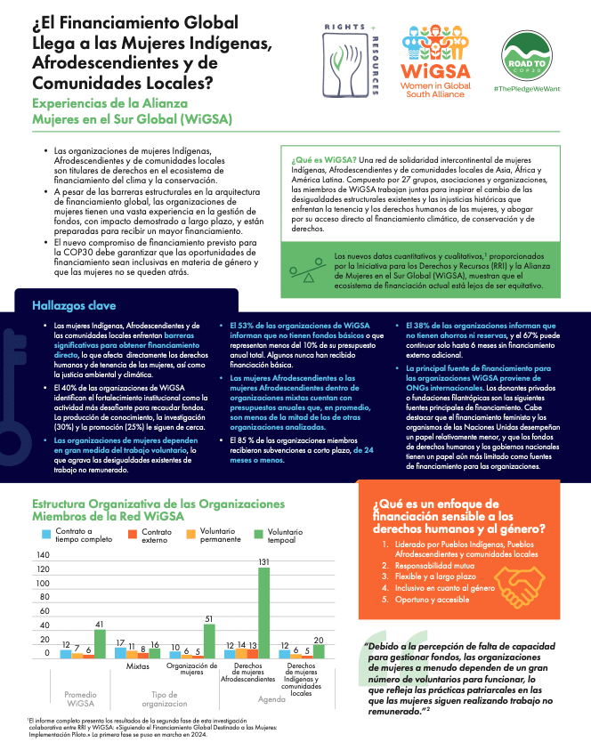 Para este análisis, la RRI colaboró con la Alianza de Mujeres del Sur Global (WiGSA) para analizar el nivel y los tipos de financiamiento proporcionados a los miembros de la red WiGSA. El análisis preliminar se publicó en 2024 y mostró que las inversiones en igualdad de género están disminuyendo y que las mujeres indígenas y afrodescendientes siguen recibiendo un financiamiento extremadamente insuficiente. Este nuevo informe presenta los resultados de la segunda fase de esta investigación colaborativa: «Seguimiento de la financiación global que llega a las mujeres: implementación piloto,» cuyo objetivo es identificar y analizar los obstáculos estructurales a los que se enfrentan las mujeres Indígenas, Afrodescendientes y de las comunidades locales para acceder a la financiación. Las conclusiones preliminares se publicaron en 2024.