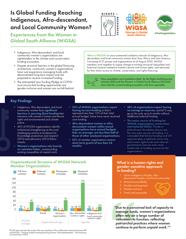 For this analysis, RRI collaborated with the Women in Global South Alliance (WiGSA) to analyze the level and types of funding provided to WiGSA network members. The preliminary analysis was released in 2024, and showed that investments in gender equality are on the decline, and Indigenous and Afro-descendant women remain severely underfunded. This new report presents the results of the second phase of this collaborative research: “Tracking Global Funding Reaching Women: Pilot Implementation,” which aims to identify and analyze the structural obstacles Indigenous, Afro-descendant, and local community women face in accessing funding. The preliminary findings were published in 2024.